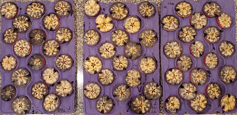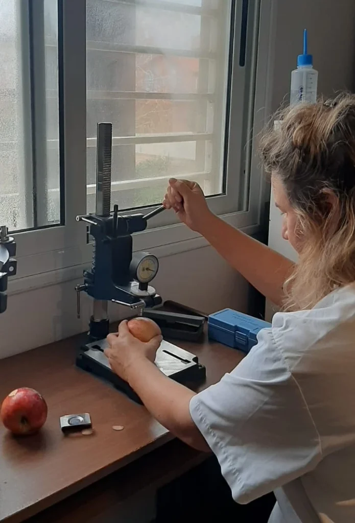 Tomamos muestras directamente en chacra o recibimos las enviadas por el productor, y analizamos parámetros como firmeza, sólidos solubles, acidez, color e índice de almidón.